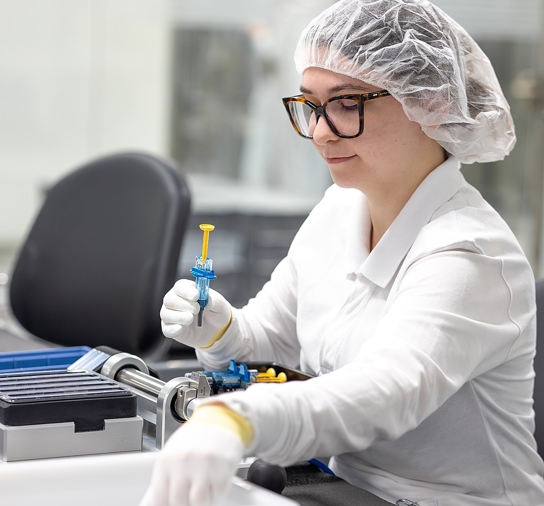 No two days are exactly alike. Before my shift begins, I check the digital board to see which resource I've been assigned, and then I report there. You're welcome to state your preferences, which are often taken into consideration. Then, the shift coordinator gives my colleagues and me a briefing on the upcoming process. After that, we start production. Using assembly machines, we assemble syringes into auto-injectors and safety devices and then package them for shipping. We also pack syringes and vials in trays and folding boxes. Each workstation focuses on either assembly, inspection, packaging, or sealing cartons. The best part is that we rotate these tasks several times a day. This not only provides variety but also reduces physical strain. My uniform—a white suit and a cap—is part of the job. The men also wear beard guards.